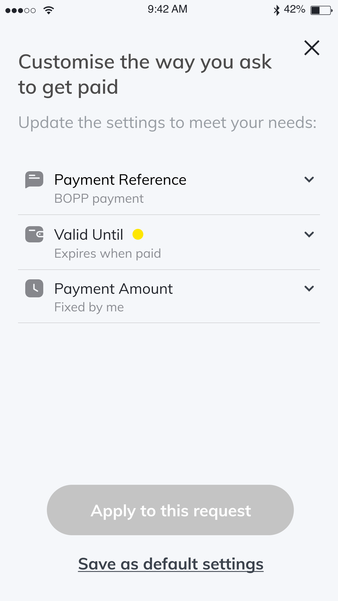 Step 2. Once you have defined these settings you can apply them to this request only or click 'Save as default settings' to apply them to future pay requests.
